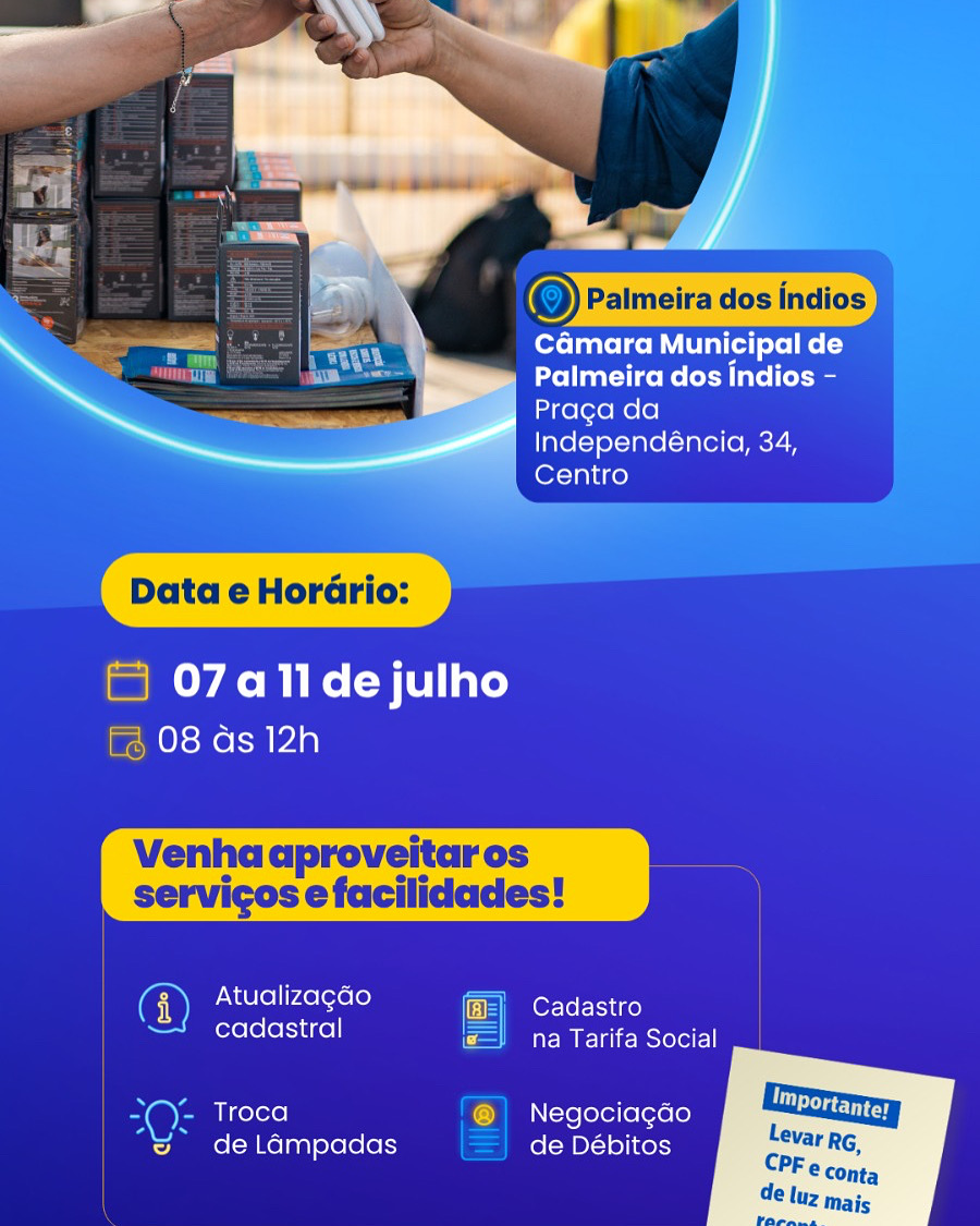 De 7 a 11 de julho, a Câmara de Vereadores de Palmeira dos Índios sediará um mutirão de atendimento da Equatorial Alagoas, das 8h às 12h. A ação visa atender a população com serviços essenciais, especialmente voltados para quem mais precisa.